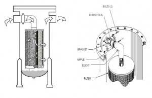 A thick bed of glass fibre (the element) facilitates self-cleaning by continuous draining; contaminants are trapped at various stages within the fibre bed, internally as well as at the surface. This prevents clogging and keeps pressure drop low.